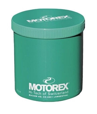 Een pot wit smeervet geschikt voor de ketting. Ten opzichte van de gebruiksvriendelijke kettingsprays kan met de Motorex White Grease op de conventionele manier worden gesmeerd.